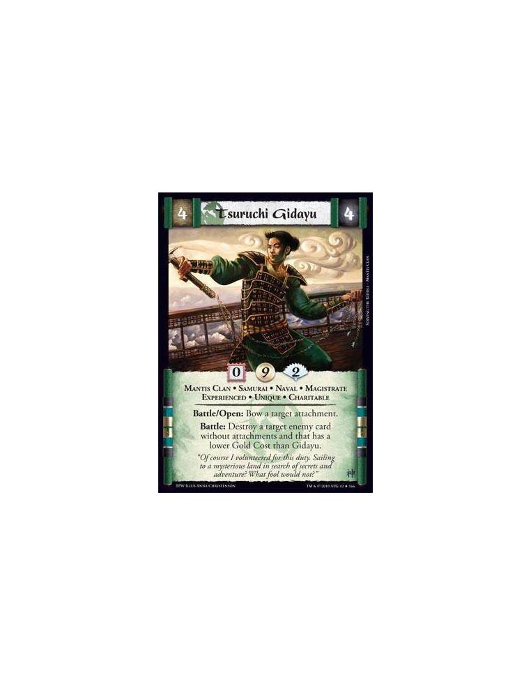 Mantis Clan • Samurai • Naval • Magistrate • Experienced • Unique • Charitable. Battle/Open: Bow a target attachment. Battle: Destroy a target enemy card without attachments and that has a lower Gold Cost than Gidayu