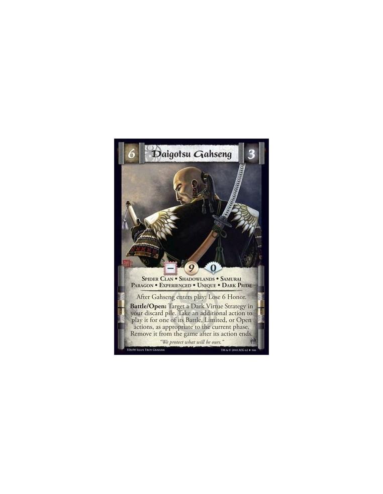 After Gahseng enters play: Lose 6 Honor. Battle/Open: Target a Dark Virtue Strategy in your discard pile. Take an additional action to play it for one of its Battle, Limited, or Open actions, as appropriate to the current phase. Remove it from the game after its action ends.