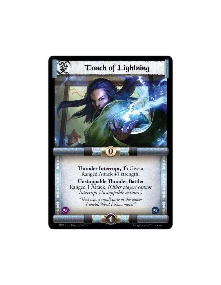 Touch of Lightning  - Thunder Interrupt, Bow: Give a Ranged Attack +1 strength. Unstoppable Thunder Battle: Ranged 1 Attack. (Ot