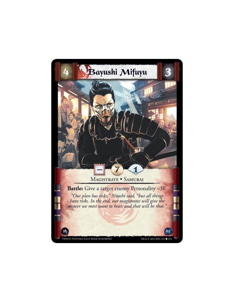 KharmicReduce all Honor gains and losses from Holdings by 1 (minimum zero).Open: Put this Event into play. Discard it before your next turn ends. You may target and dishonor a Crane Clan Personality.