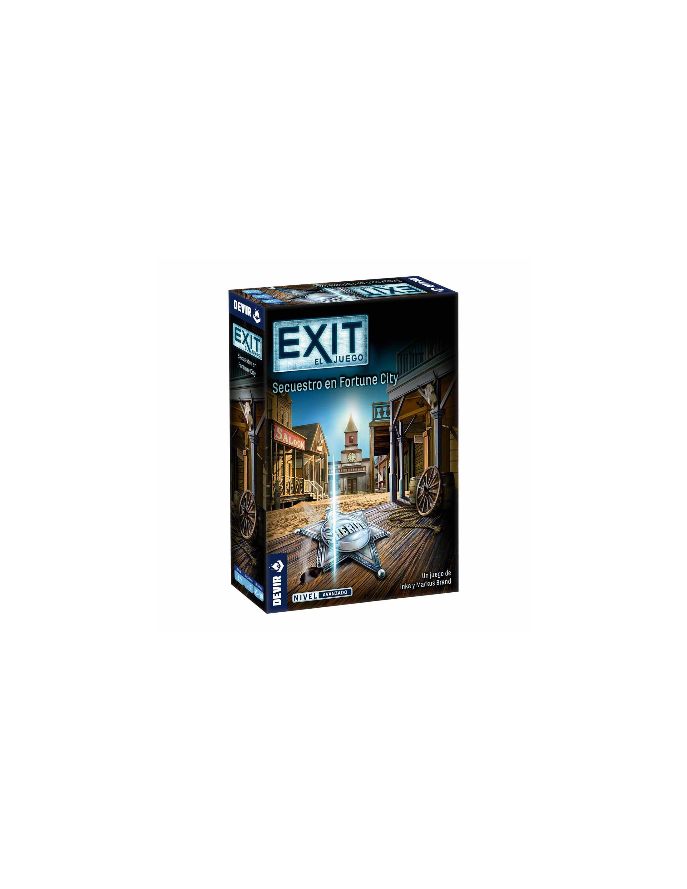 Exit: Secuestro en Fortune City es un juego de escape cooperativo diseñado por Inka y Markus Brand, que se puede disfrutar en solitario o en un grupo de hasta 4 personas, a partir de 12 años, en partidas que pueden durar entre 45 y 90 minutos. A través de un gran mazo de 85 cartas, un disco descodificador y algunos artefactos especiales, los jugadores podrán explorar e interactuar con el entorno y todo lo que vayan encontrando en su viaje.