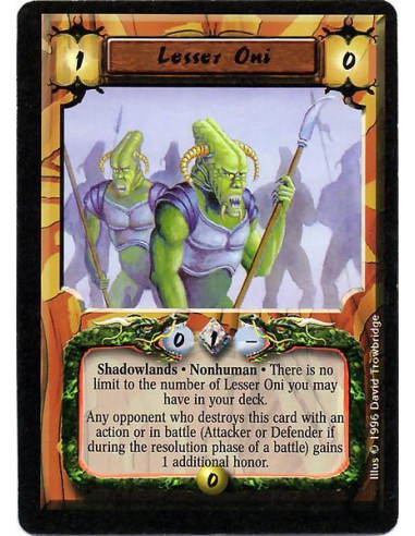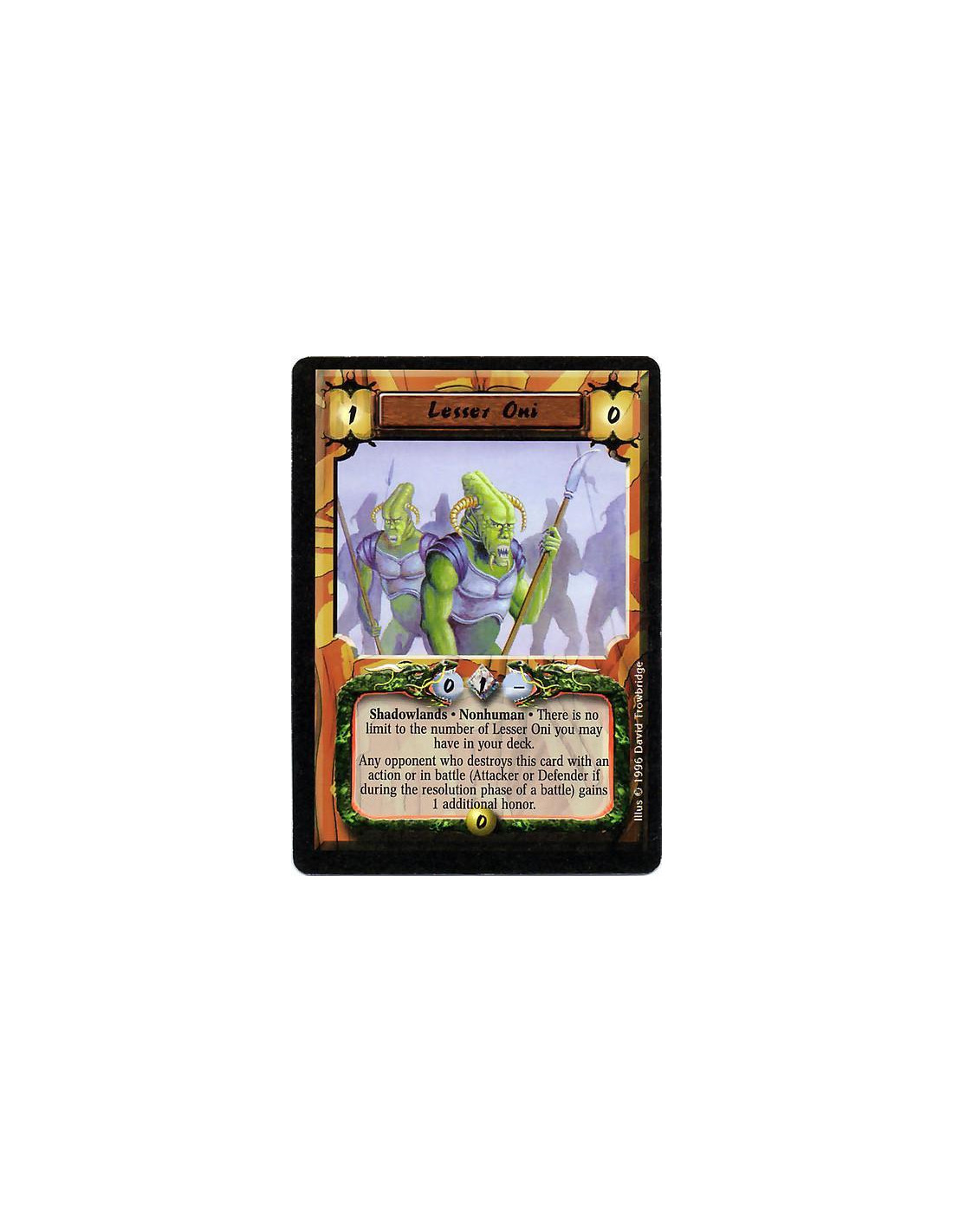 Shadowlands. Nonhuman There is no limit to the number of Lesser Oni you may have in your deck. Any opponent who destroys this card with an action or in battle (Attacker or Defender if during the resulotion phase of a battle) gains 1 additional honor.
