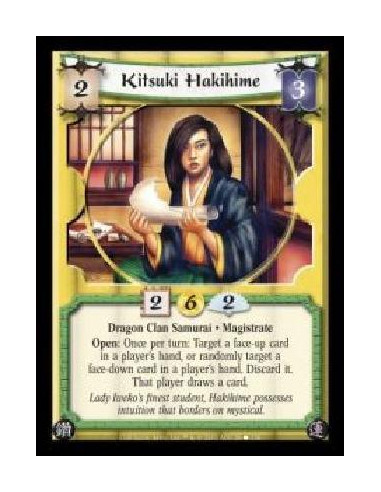 Kitsuki Hakihime  - Dragon Clan Samurai · Magistrate. Open: Once per turn: Target a face-up card in a player's hand, or randomly