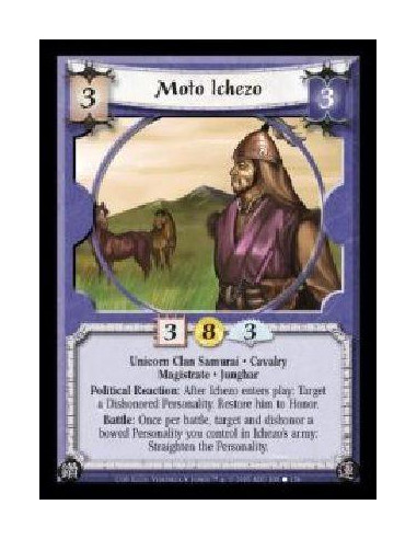Moto Ichezo  - Unicorn Clan Samurai · Cavalry · Magistrate · Junghar. Political Reaction: After Ichezo enters play: Target a Dis