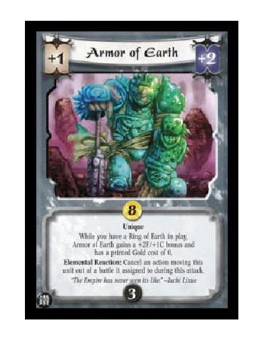 Unique While you have a Ring of Earth in play, Armor of Earth gains a +2F/+1C bonus and has a printed Gold cost of 0. Elemental Reaction: Cancel an action moving this unit out of a battle it assigned to during this attack.