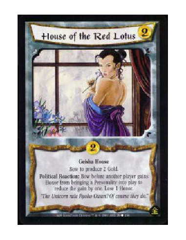 Geisha House Bow House of the Red Lotus to produce 2 Gold. Political Reaction: Before another player gains Honor from bringing a Personality into play, bow House of the Red Lotus to lower the gain by one. Lose 1 Honor.