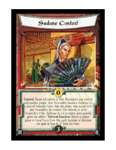 Limited: Target a Courtier or Poet Personality you control and another player. Your Personality issues a challenge to a duel of Personal Honor that the player may accept with any Personality he controls. The winner, or your Personality if the challenge is not accepted, permanently gains the ability ?Political Reaction: Before a player gains or loses Honor, bow this card: Increase or decrease the gain or loss by 2.? Bow the loser