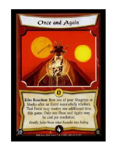 Kiho Reaction: Bow one of your Shugenja or Monks after an Event successfully resolves. That Event may resolve one additional time this game. Only one Once and Again may be cast per resolution.
