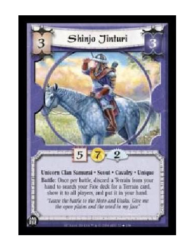 Shinjo Jinturi  - Unicorn Clan Samurai . Scout . Cavalry . Unique Battle: Once per battle, discard a Terrain from your hand to s