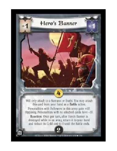 Will only attach to a Samurai or Bushi. You may attach this card from your hand as a Battle aciton. Personalities with Followers in this army gain +1F. Opposing Personalities with no attached cards have -1F. Reaction: Once per turn, after Hero's Banner is destroyed while in an army, return it to your hand and reduce its Gold cost to 0 until the battle ends.