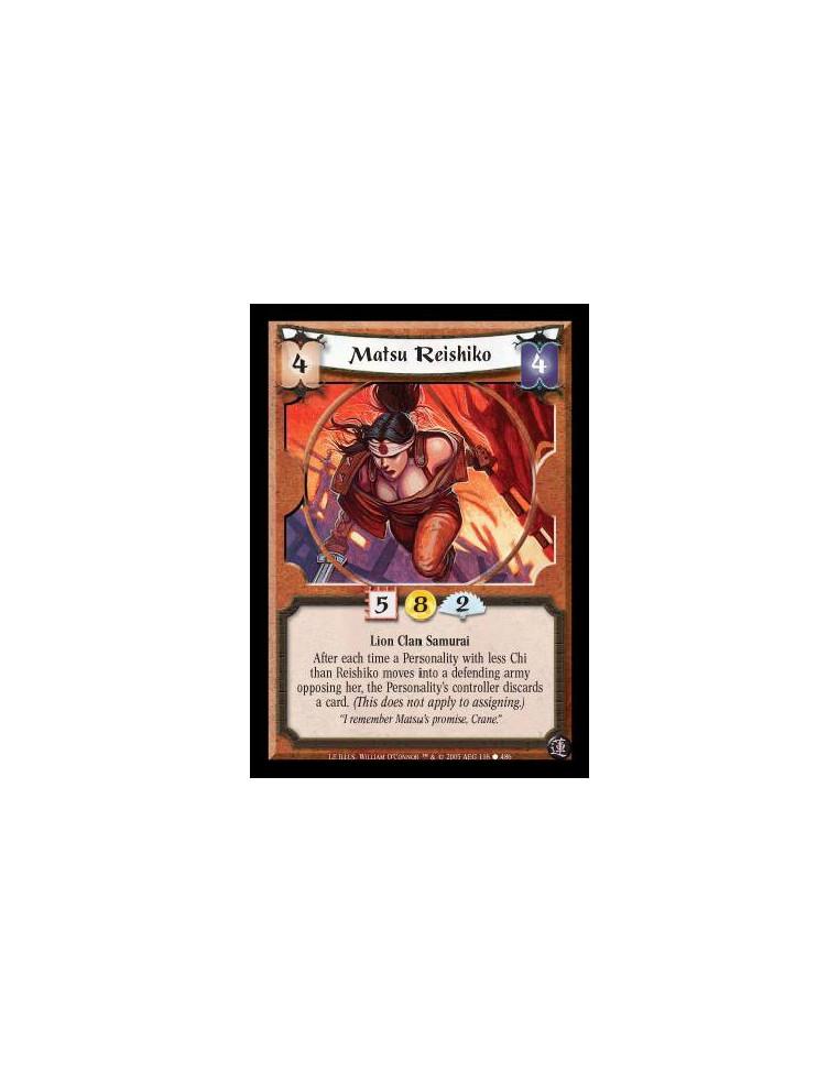 Matsu Reishiko  - Lion Clan Samurai. After each time a Personality with less Chi than Reishiko moves into a defending army oppos