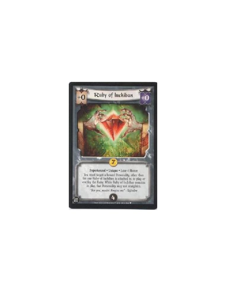 Experienced. Unique. Lose 4 Honor. You must target a bowed Personality, other than the one Ruby of Iuchiban is attached to, to play or overlay the Ruby. While Ruby of Iuchiban remains in play, that Personality may not straighten.
