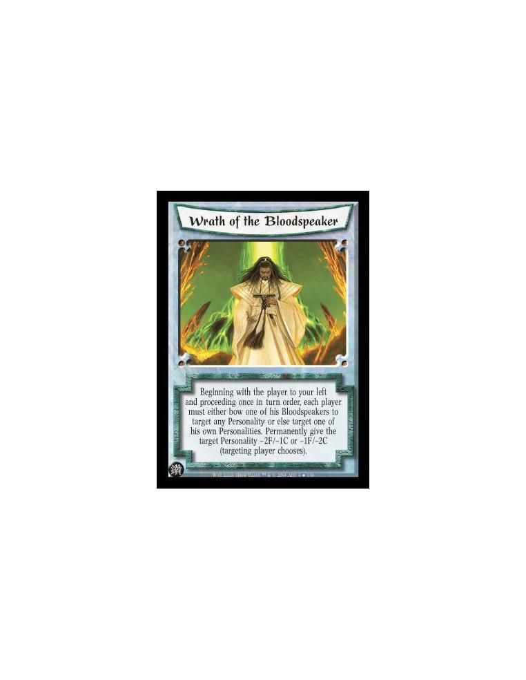 Beginning with the player to your left and proceeding once in turn order, each player must either bow one of his Bloodspeakers to target any Personality or else target one of his own Personalities. Permanently give the target Personality -2F/-1C or -1F/-2