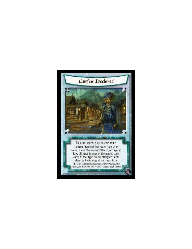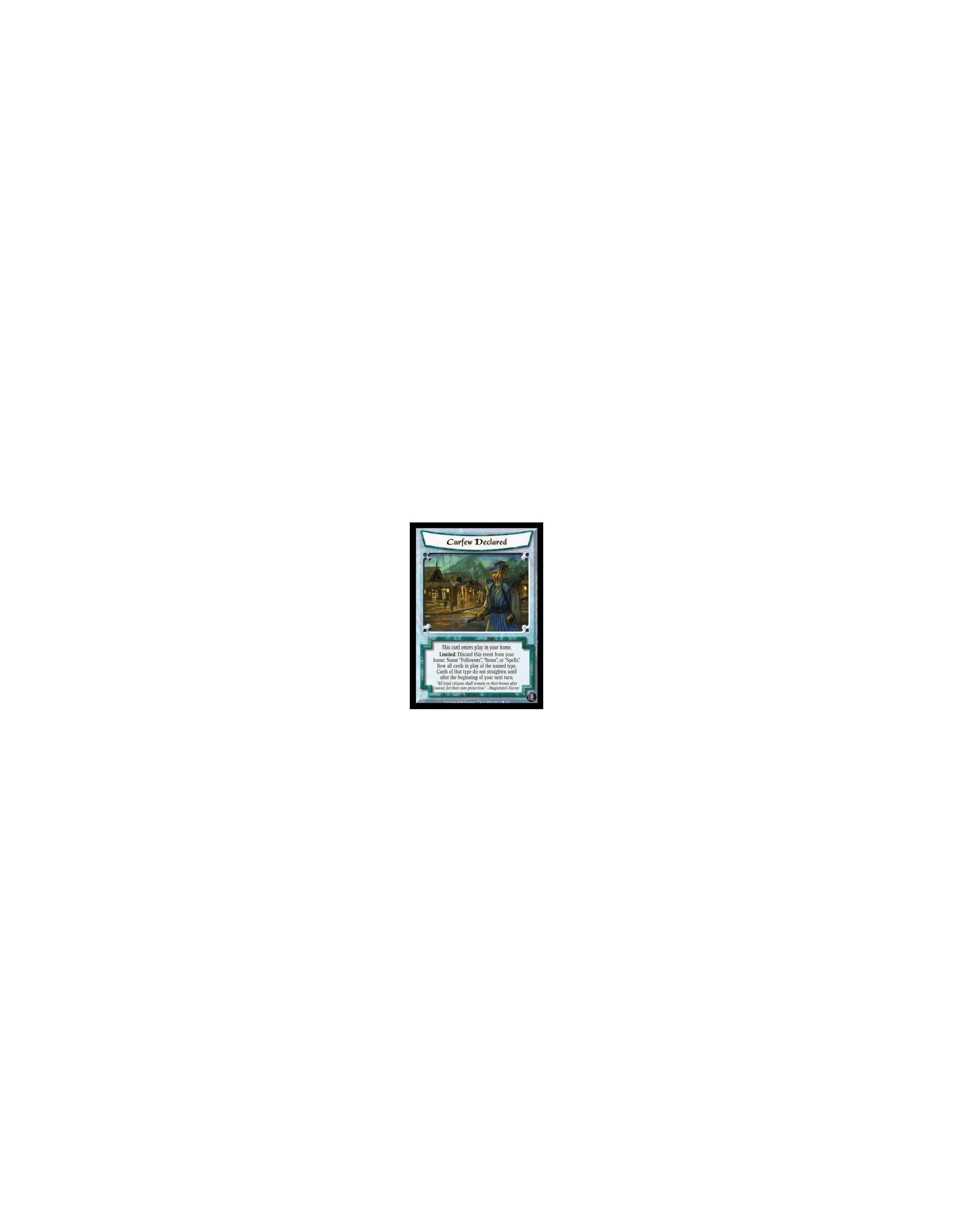 Curfew Declared  - This card enters play in your home. Limited: Discard this event from your home: Name "Followers", "Items", or