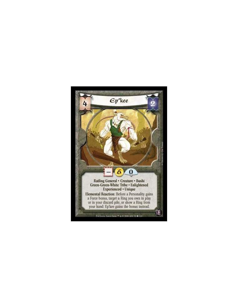 Ratling General · Creature · Bushi · Green-Green-White Tribe · Enlightened · Experienced · Unique. Elemental Reaction: Before a Personality gains a Force bonus, target a Ring you own in play or in your discard pile, or show a Ring from your hand: Ep'kee gains the bonus instead.