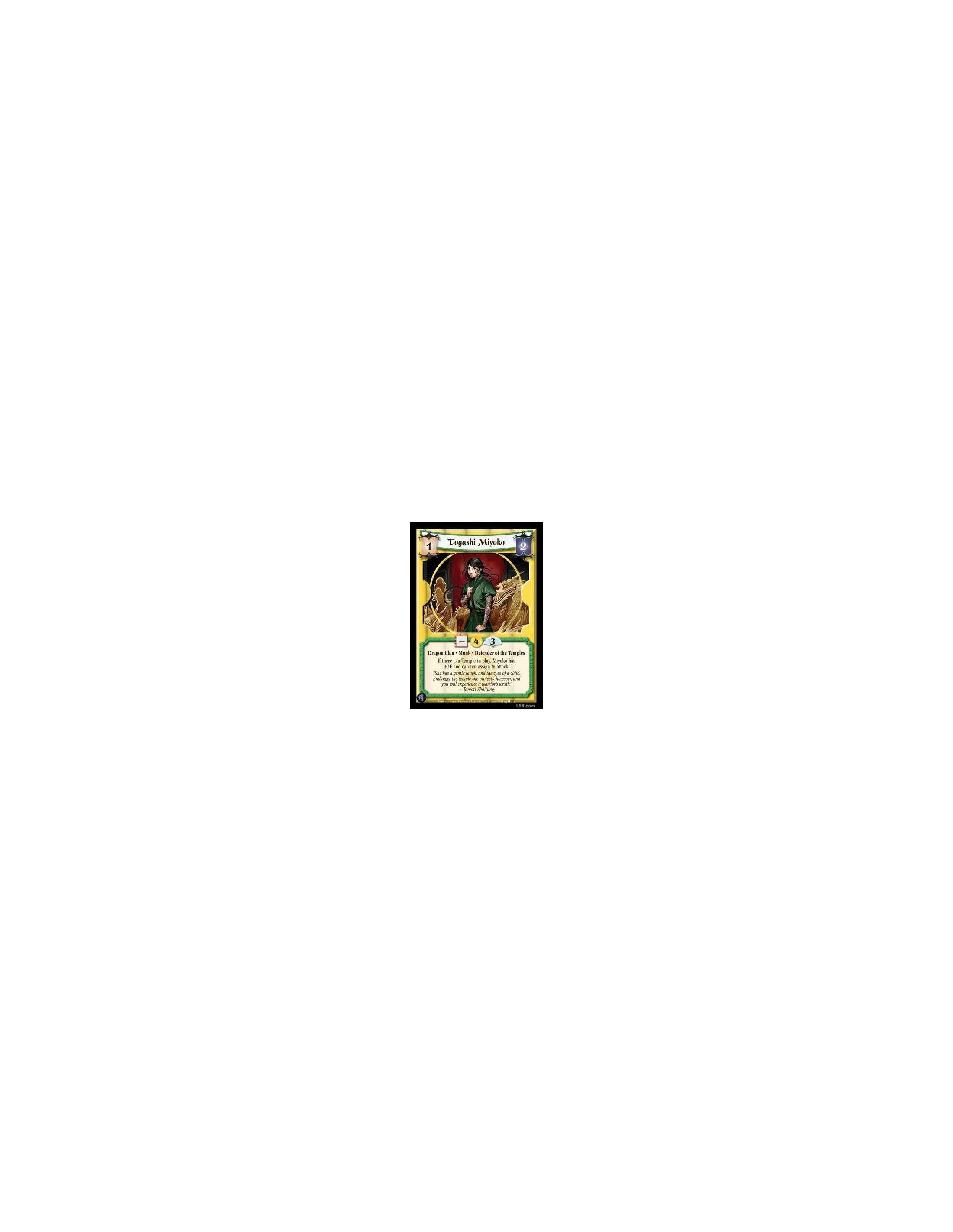 Dragon Clan · Monk · Defender of the Temples If there is a Temple in play, Miyoko has +3F and cannot assign to attack.