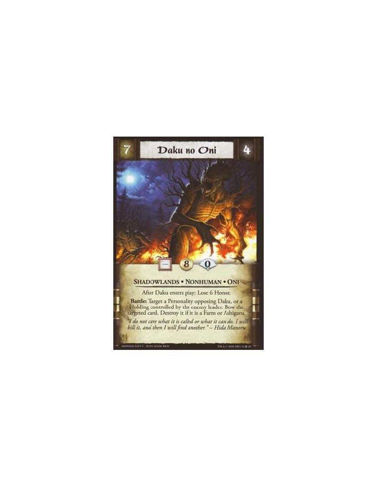 Shadowlands * Oni * Nonhuman After Daku no Oni enters play: Lose 6 Honor. Battle: Bow a target Personality opposing Daku no Oni, or bow one of the enemy leader’s target Holdings. Destroy the targeted card if it is a Farm or Ashigaru.