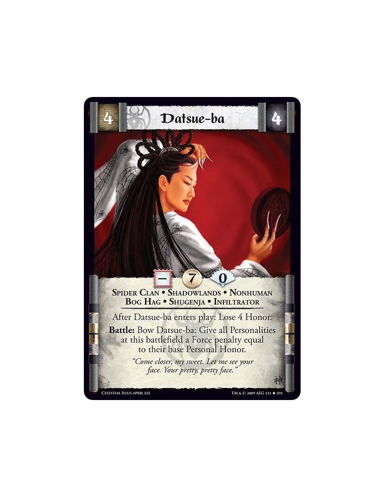 Spider Clan • Shadowlands • Nonhuman • Bog Hag • Shugenja • Infiltrator After Datsue-ba enters play: Lose 4 Honor. Battle: Bow Datsue-ba: Give all Personalities at this battlefield a Force penalty equal to their base Personal Honor.