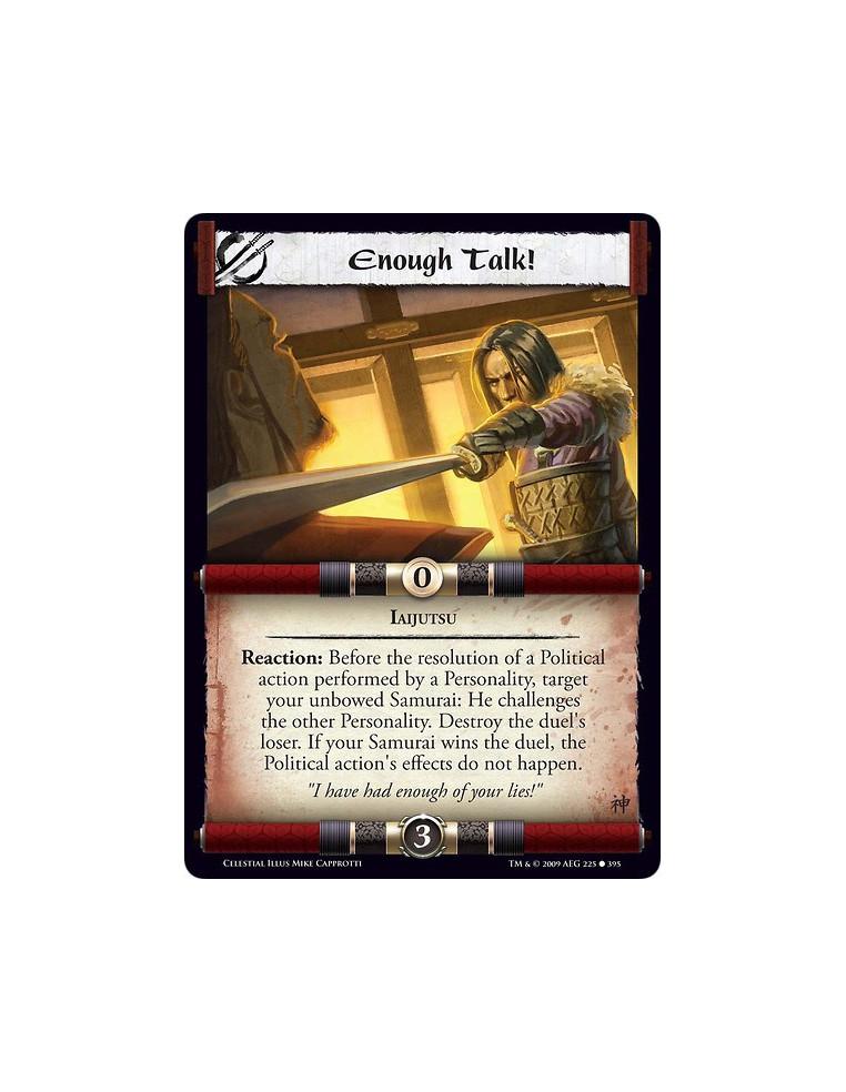 Spider Clan • Shadowlands • Ninja • DisplacerAfter Bunoro enters play: Lose 2 Honor. Battle: Target a non-Unique enemy Personality: Turn all cards in his controller’s provinces face-up. You may overlay a face-up Personality in one of the provinces on the target, refilling the province with the target.