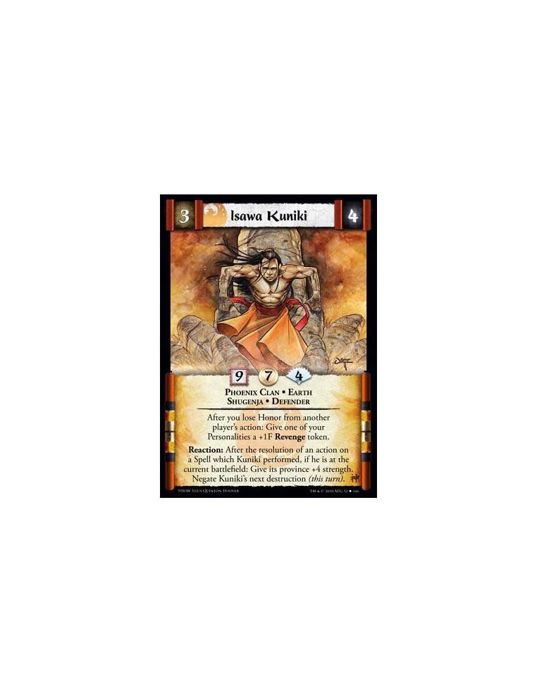 Phoenix Clan • Earth • Shugenja • Defender After you lose Honor from another player’s action: Give one of your Personalities a +1F Revenge token. Reaction: After the resolution of an action on a Spell which Kuniki performed, if he is at the current battlefield: Give its province +4 strength. Negate Kuniki’s next destruction (this turn).