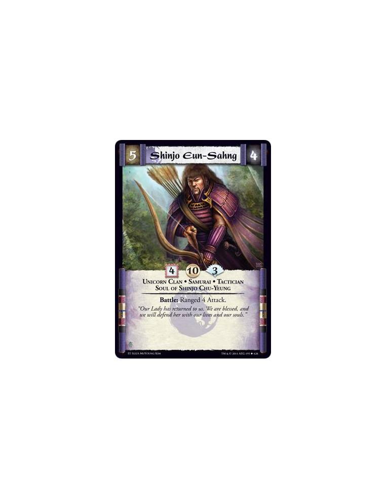 Unicorn Clan • Samurai • Soul of Shinjo Genya • Cavalry(Once per turn, as an Absent Engage, move your unbowed Personality in a Cavalry unit to this battle.)Battle: Bow a target non-Unique enemy Personality with no attachments and higher Force.