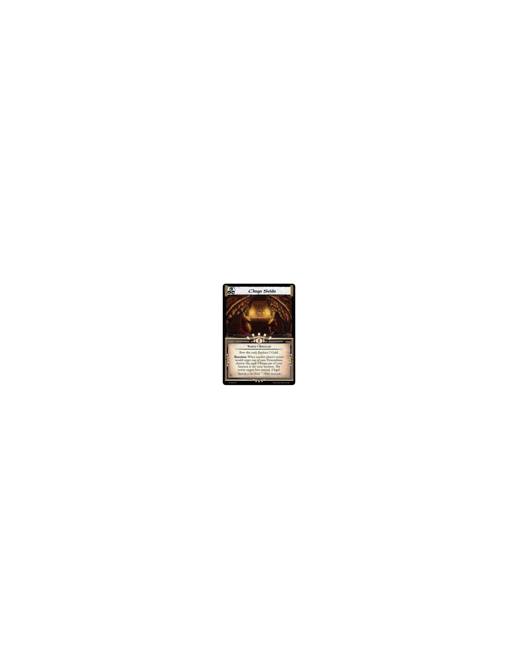 Bow this card: Produce 2 Gold. Reaction: When another player’s actionwould target one of your Personalities, destroy this card: Choose one of your Samurai at the same location. The action targets him instead, if legal.