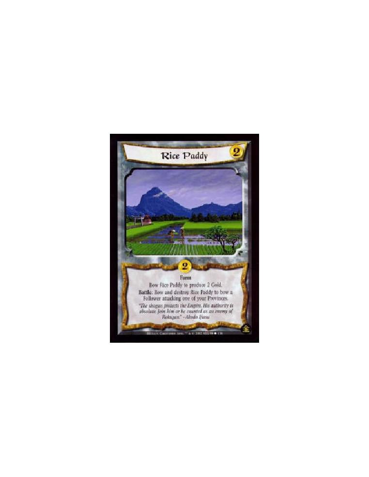 Rice Paddy  - FarmBow this card: Produce 2 Gold.Battle: Bow and destroy this card, and target an attacking Follower at one of yo