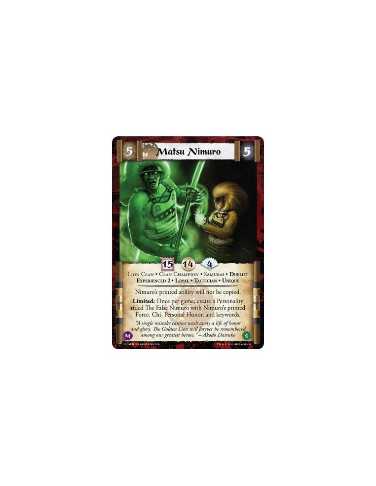 Lion Clan • Water • ShugenjaLimited: Create a 2F/2C/3PH Lion Clan • Samurai • Ancestor • Spirit Personality. Battle: Bow your performing Ancestor Personality and target an enemy card without attachments: Destroy it. Gain 1 Honor.