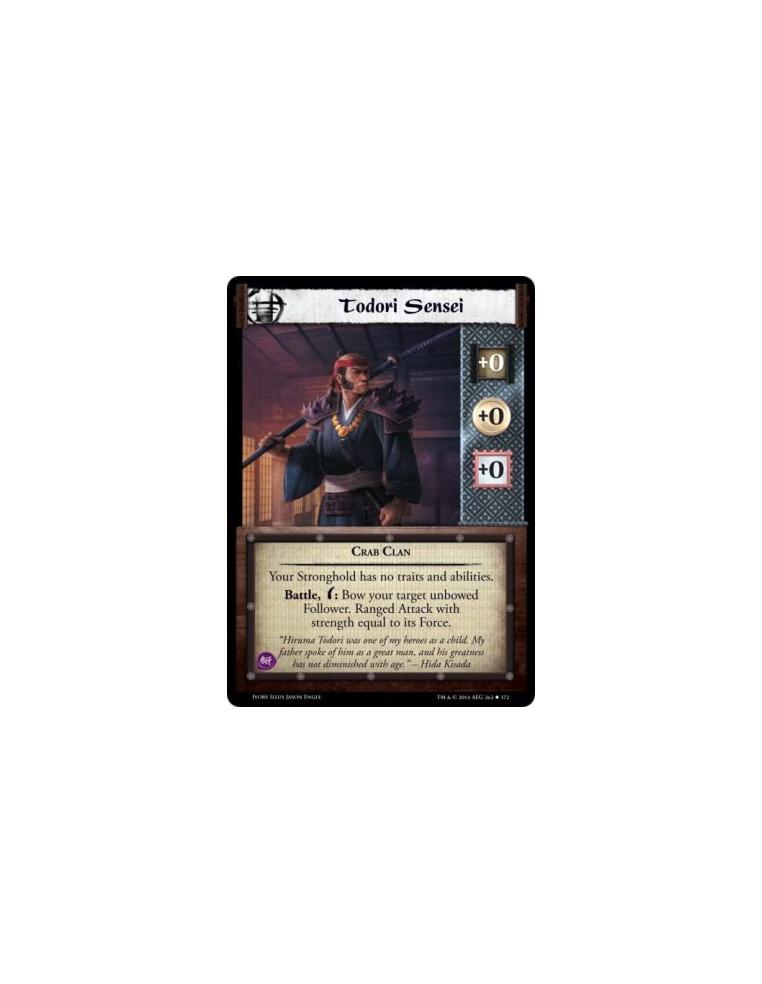 Todori Sensei  - Crab ClanYour Stronghold has no traits and abilities. Battle, w: Bow your target unbowed Follower. Ranged Attac