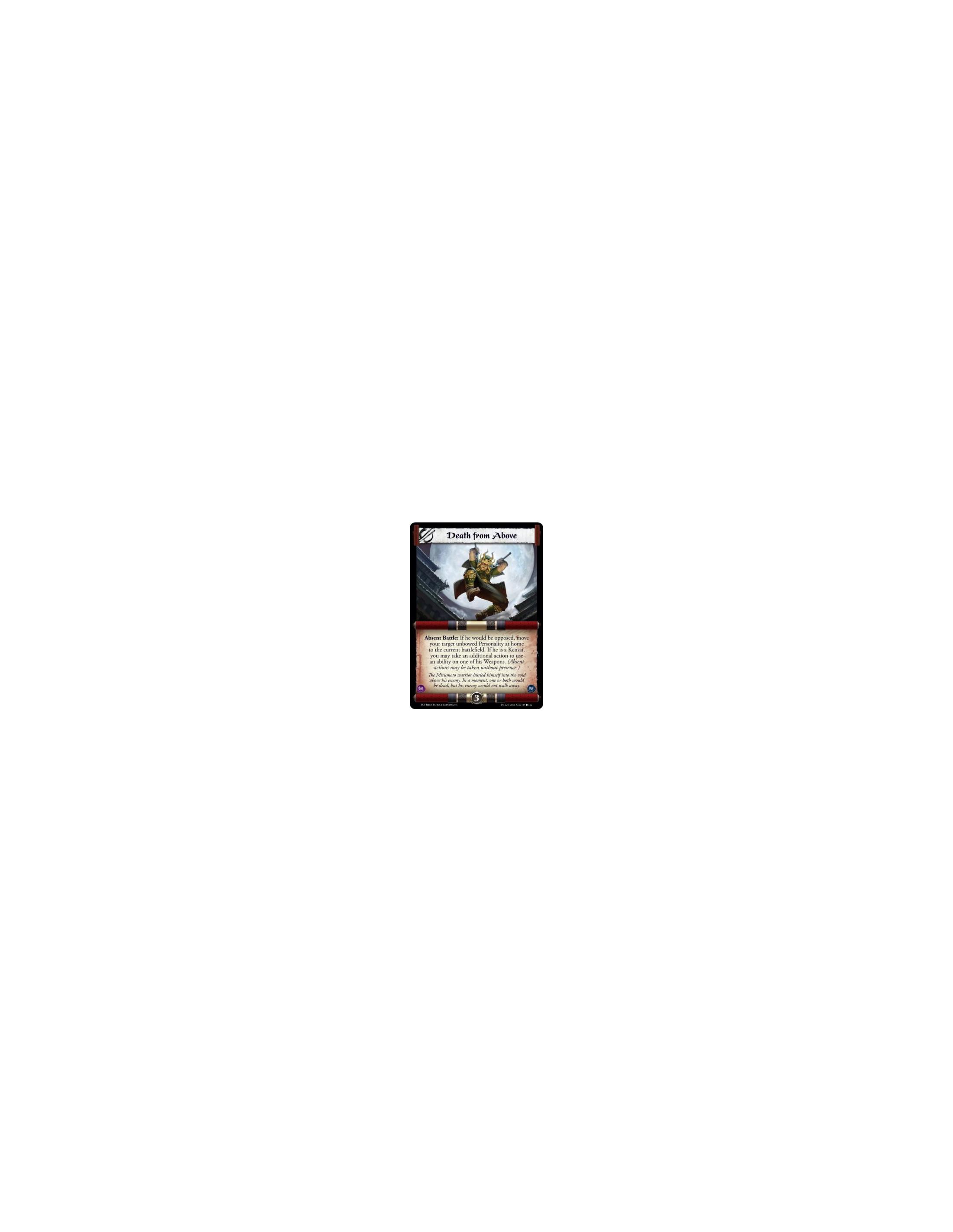 Absent Battle: If he would be opposed, move your target unbowed Personality at home to the current battlefield. If he is a Kensai, you may take an additional action to use an ability on one of his Weapons. (Absent actions may be taken without presence.)