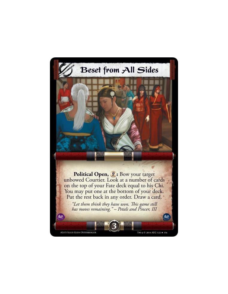 This card costs 1 less Gold for each unit you control at the current battlefield.Battle: Move a target enemy Personality home. If you are a Scorpion Clan player, his controller loses 2 Honor.
