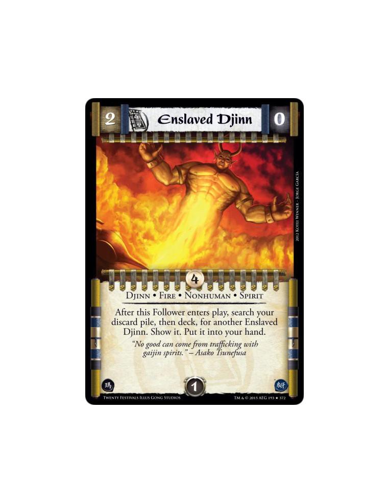 After this Follower enters play, search your discard pile, then deck, for another Enslaved Djinn. Show it. Put it into your hand.