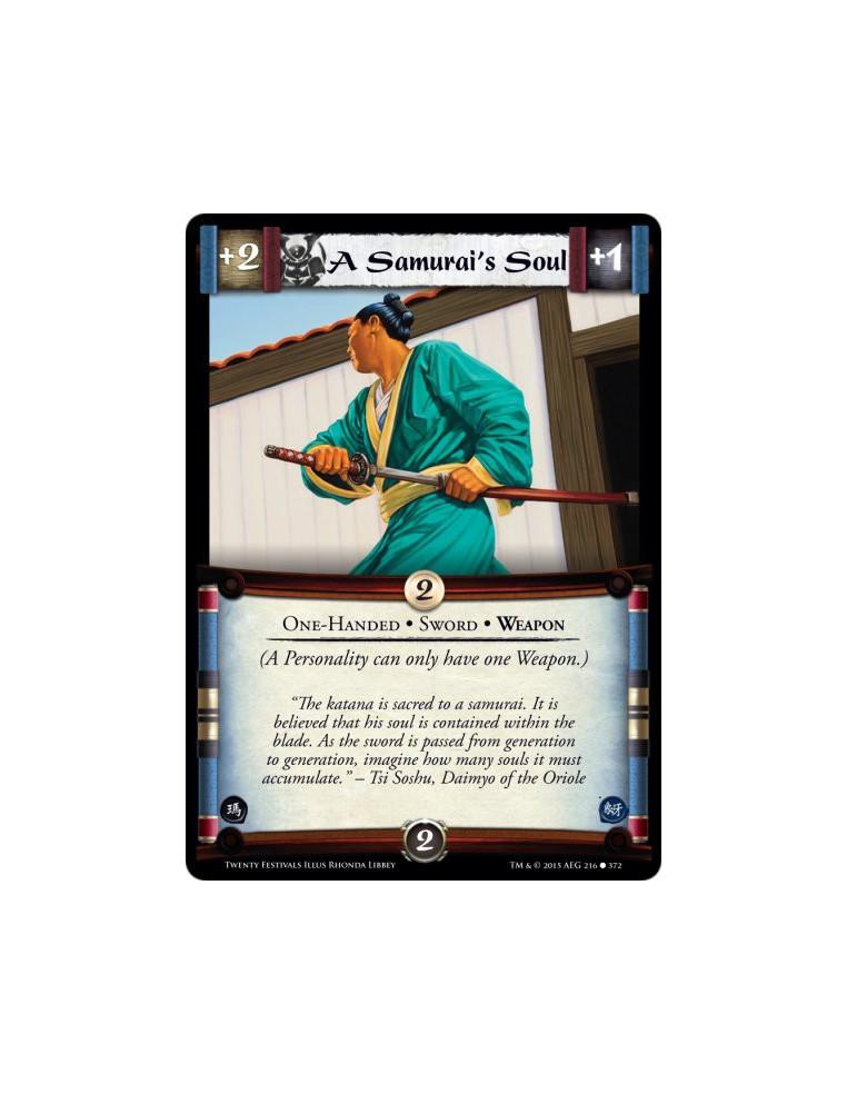"The katana is sacred to a samurai. It is believed that his soul is contained within the blade. As the sword is passed from generation to generation, imagine how many souls it must accumulate." - Tsi Soshu, Daimyo of the Oriole