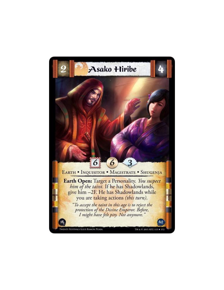 Phoenix Clan Grand Master of the Elements. Shugenja. Double Chi. Experienced 2 Limited: Once per turn, get a kiho or spell from your fate deck, show it to the other players, and add it to your hand. Discard a card from your hand. Shuffle your deck.