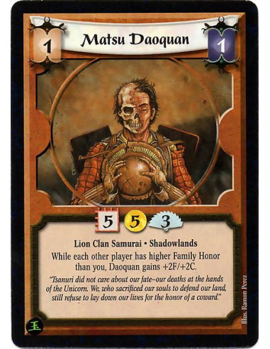 Will only attach to a Samurai or Bushi. Reaction: Before this Personality is moved or destroyed while in a battle, move Hardy Infantry to one of your other Personalities in that battle.