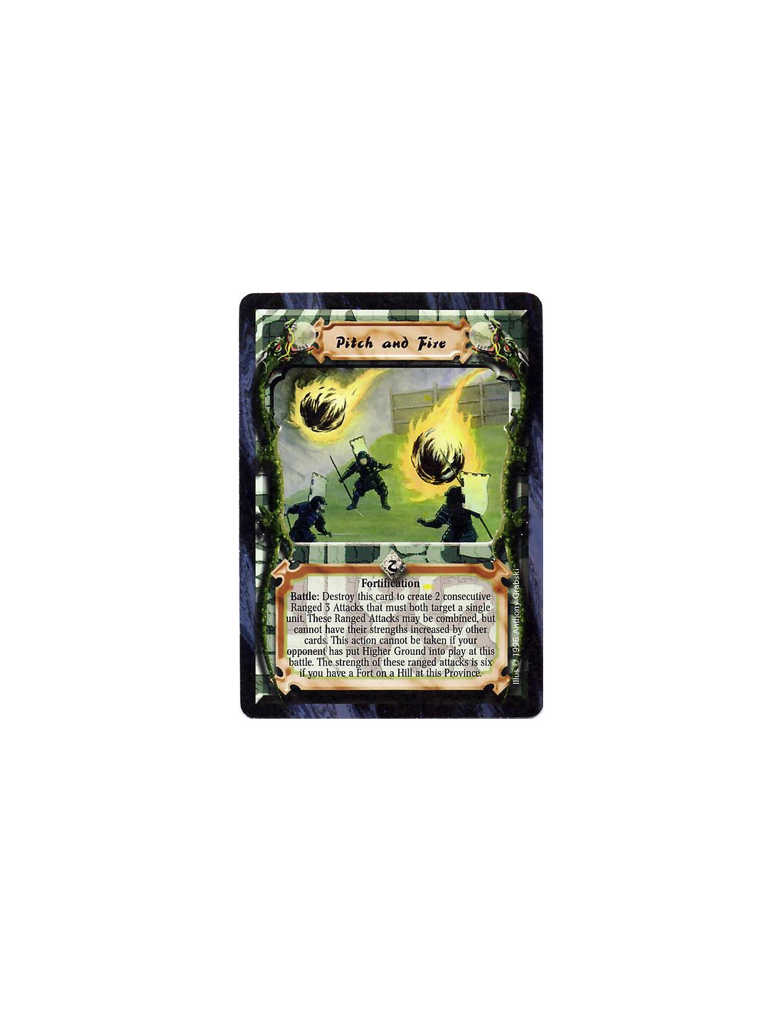 Fortification Battle: If your opponent does not have Higher Ground in play, destroy Pitch and Fire for two consecutive Ranged 3 Attacks that target one unit. You can combine the ranged attacks, but other cards cannot raise the ranged attacks' stregth. If you have a Fort on a Hill at this Province, the ranged attacks each have 6 stregth.