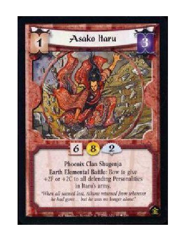 Asako Itaru  - Phoenix Clan Shugenja Earth Elemental Battle: Bow to give +2F or +2C to all defending Personalities in Itaru's ar