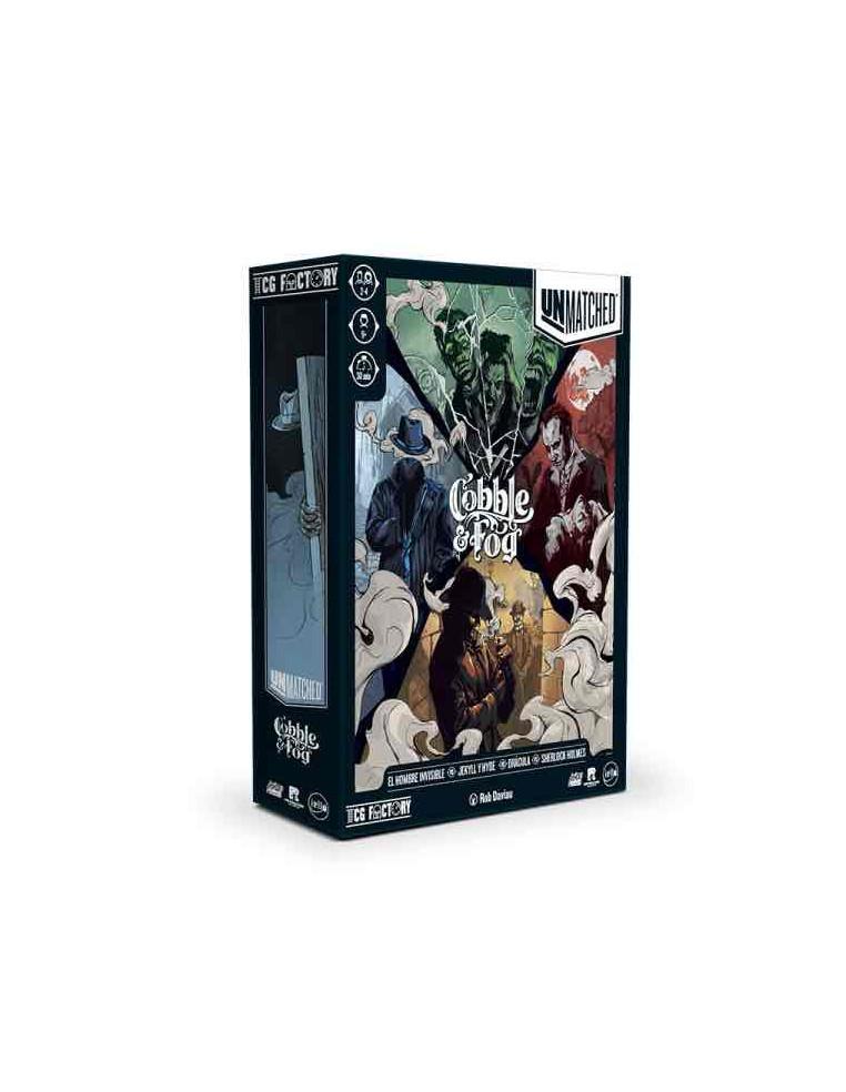 El Doctor Jekyll, Drácula, Sherlock Holmes, el hombre invisible Nuevos contendientes se unen a Unmatched con Cobble & Fog, expansión autojugable para el juego de mesa de los combates imposibles! Unmatched Cobble & Fog es la segunda expansión para el juego de miniaturas con cartas Unmatched, que estrena su periplo en la lengua de cervantes con Unmatched Battle of Legends Volumen 1 y con Unmatched Robin Hood VS Bigfoot. Este nuevo refuerzo incluye cuatro nuevos personajes con sus correspondientes mazos de cartas, miniaturas de héroe y fichas de ayudante, además de un mapa adicional donde llevar tus batallas imposibles. Unmatched es un juego de mesa con miniaturas y cartas altamente asimétrico en el que cada jugar asume el papel de un personaje mítico en un enfrentamiento imposible. Cuatro nuevos contendientes para añadir a tus batallas En Unmatched Cobble & Fog encontrarás los siguientes héroes con sus correspondientes ayudantes en forma de fichas: Drácula y sus vampiresas, especializadas en robar lentamente el poder a sus oponentes. Jekyll y Hyde junto a una ficha de transformación, capaz de alternar entre la astucia y la fuerza bruta para derrotar a sus contendientes. Sherlock Holmes y su siempre fiel Holmes, especializados en el cálculo estratégico. El hombre invisible, que usa sus fichas de niebla para pasar inadvertido y golpear sin ser visto. Cobble & Fog se puede jugar de manera independiente o combinándola con otras cajas de Unmatched. Prueba a enfrentar a Sherlock Holmes contra Robin Hood o a Drácula contra Alicia en el País de las Maravillas! Edad Recomendada : 10+ Duración Partida: 20 min. aprox. Jugadores: 2-4