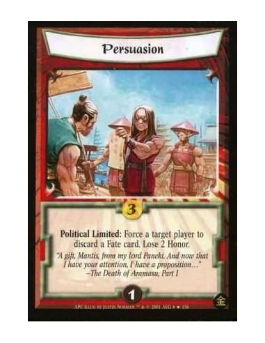 Persuasion  - Political Limited: Force a target player a Fate card. Lose 2 honor.