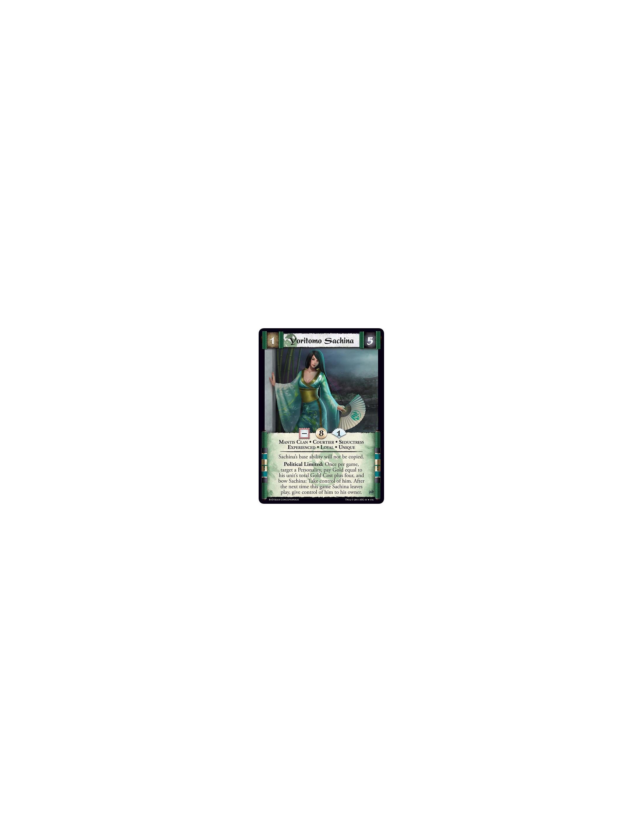 Sachina’s base ability will not be copied. Political Limited: Once per game, target a Personality, pay Gold equal to his unit’s total Gold Cost plus four, and bow Sachina: Take control of him. After the next time this game Sachina leaves play, give control of him to his owner.