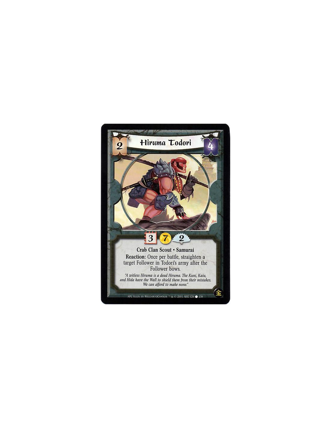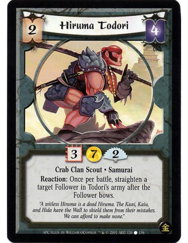 Hiruma Todori  - Crab Clan Scout. Samurai Reaction: Once per battle, after a Follower in Todori's army bows, straighten that Fol