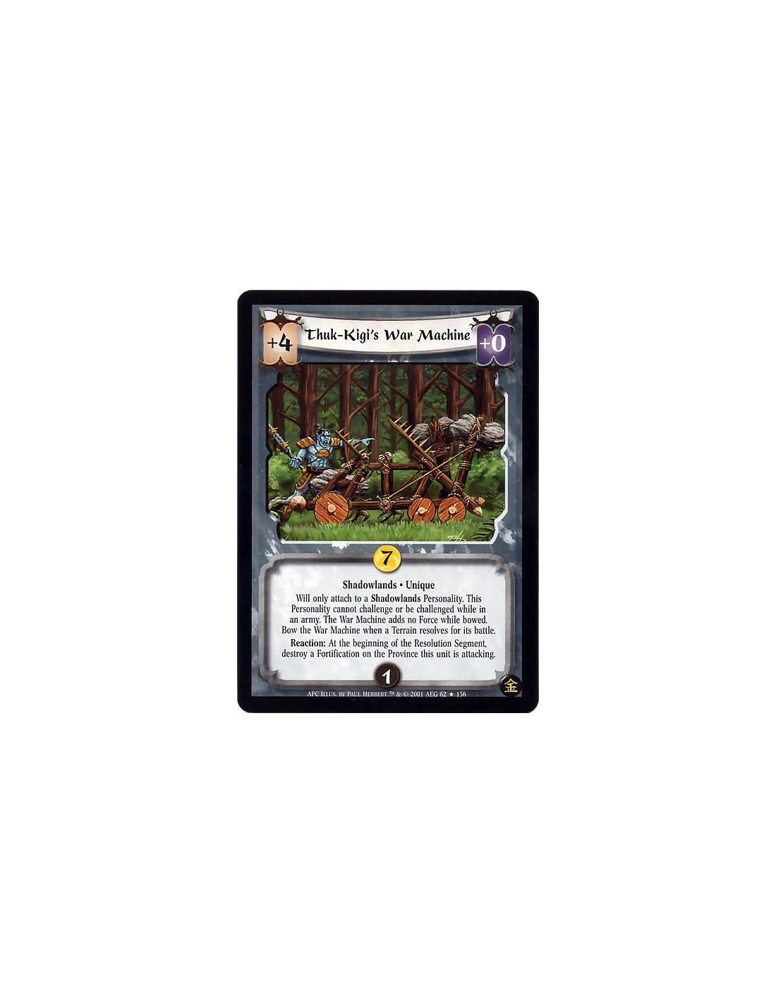Unique. Shadowlands Will only attach to a Shadowlands Personality. This Personality cannot challenge or be challenged while in an army. War Machine adds no Force to this Personality while bowed. Bow War Machine when a Terrain resolves in its battle. Reaction: At the beginning of the Resolution Segment, destroy a Fortification on the Province that this unit is attacking.