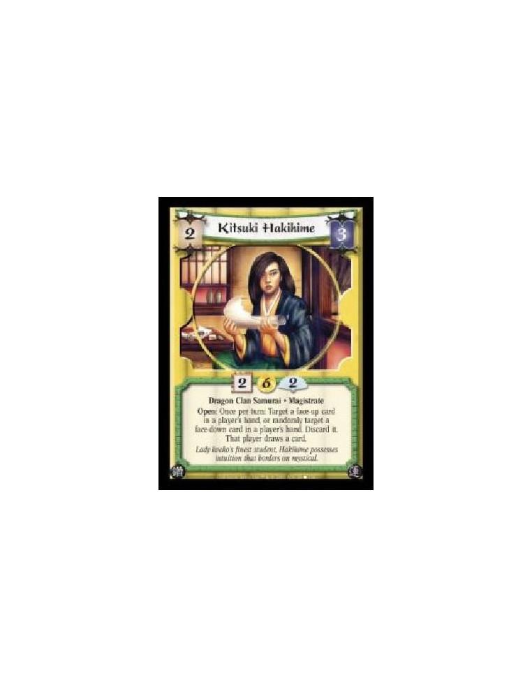 Kitsuki Hakihime (Español)  - Dragon Clan Samurai · Magistrate. Open: Once per turn: Target a face-up card in a player's hand, o
