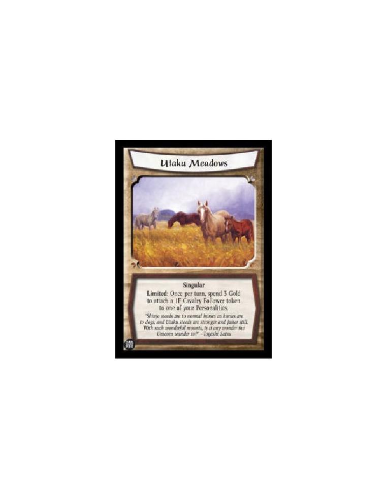 Utaku Meadows (Español)  - Singular Limited: Once per turn, spend 3 Gold to attach a 1F Cavalry Follower token to one of your Pe
