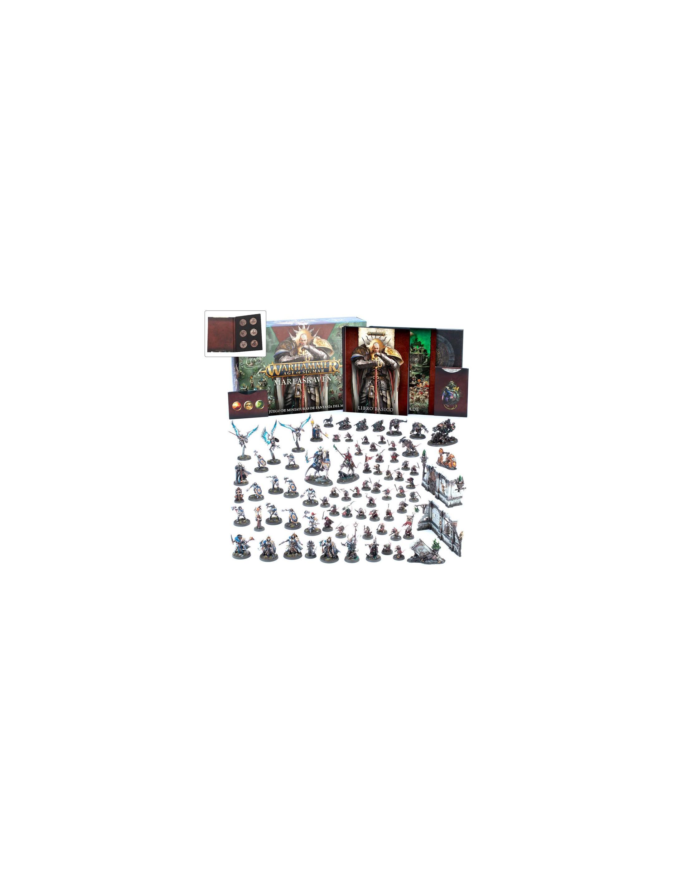 Incluye el Reglamento Básico de Warhammer Age of Sigmar con una cubierta exclusiva de este set, además de hojas de unidad y tarjetas de juego, y un reglamento de Punta de Lanza para partidas más rápid