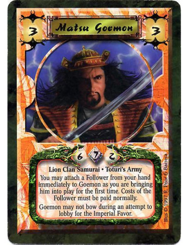 Matsu Goemon  - Lion Clan Samurai. Toturi's Army You may attach a Follower from your hand immediately to Goemon as you are bring
