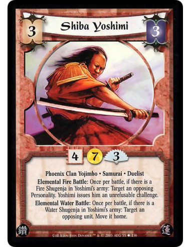 Phoenix Clan Yojimbo · Samurai · Duelist. Elemental Fire Battle: Once per battle, if there is a Fire Shugenja in Yoshimi's army: Target an opposing Personality. Yoshimi issues him an unrefusable challenge. Elemental Water Battle: Once per battle, if there is a Water Shugenja in Yoshimi's army: Target an opposing unit. Move it home