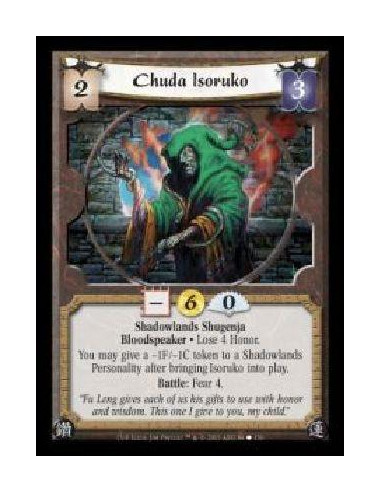 Shugenja * Corrupter * Shadowlands * Lose 4 Honor.While Hitaka is in play, raise the Gold cost of all Jade cards in the game by 2.Limited: Bow Hitaka to destroy a bowed Jade card. Lose 2 Honor.