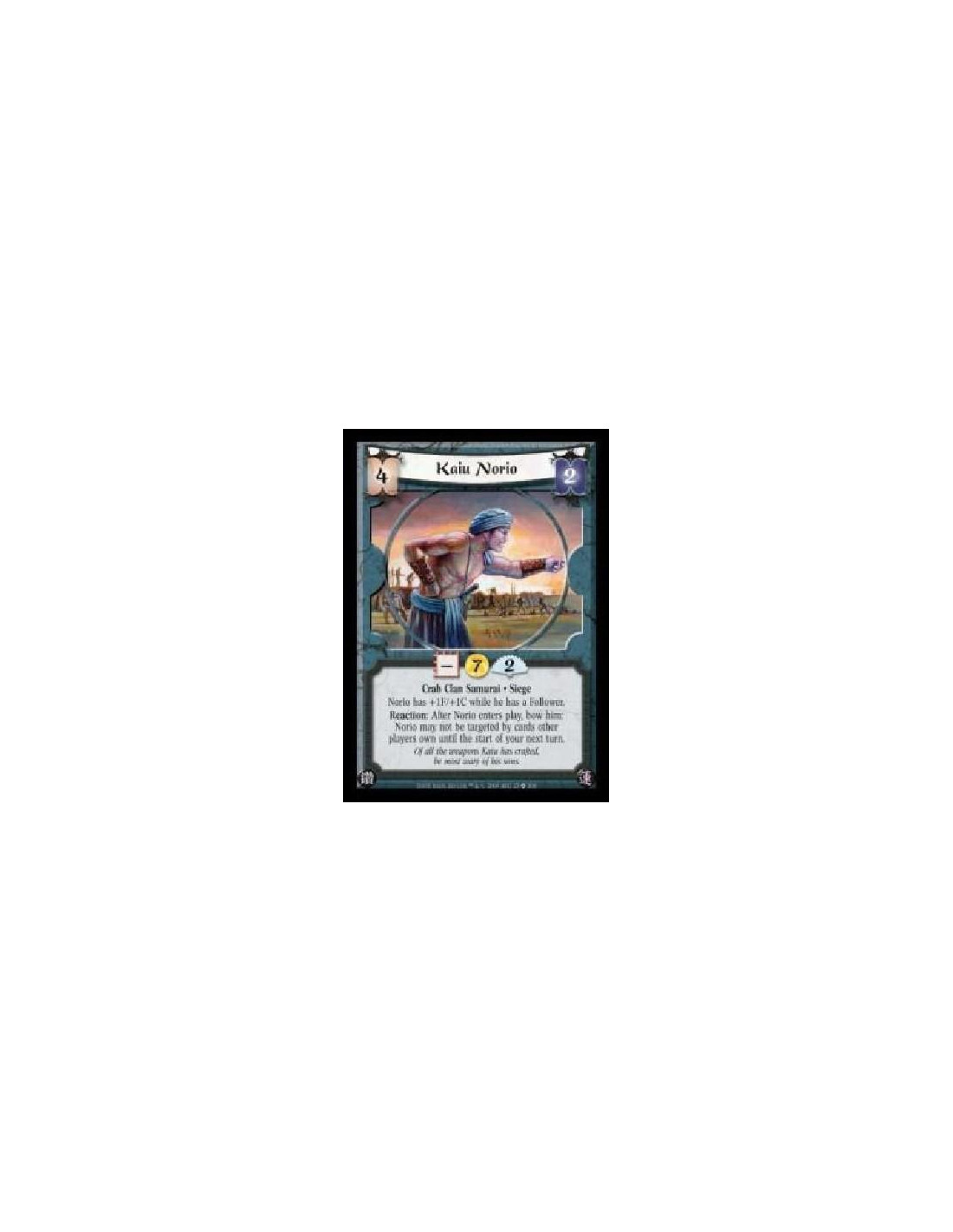 Kaiu Norio (Idioma Español)  - Crab Clan Samurai · Siege. Norio has +1F/+1C while he has a Follower. Reaction: After Norio enter