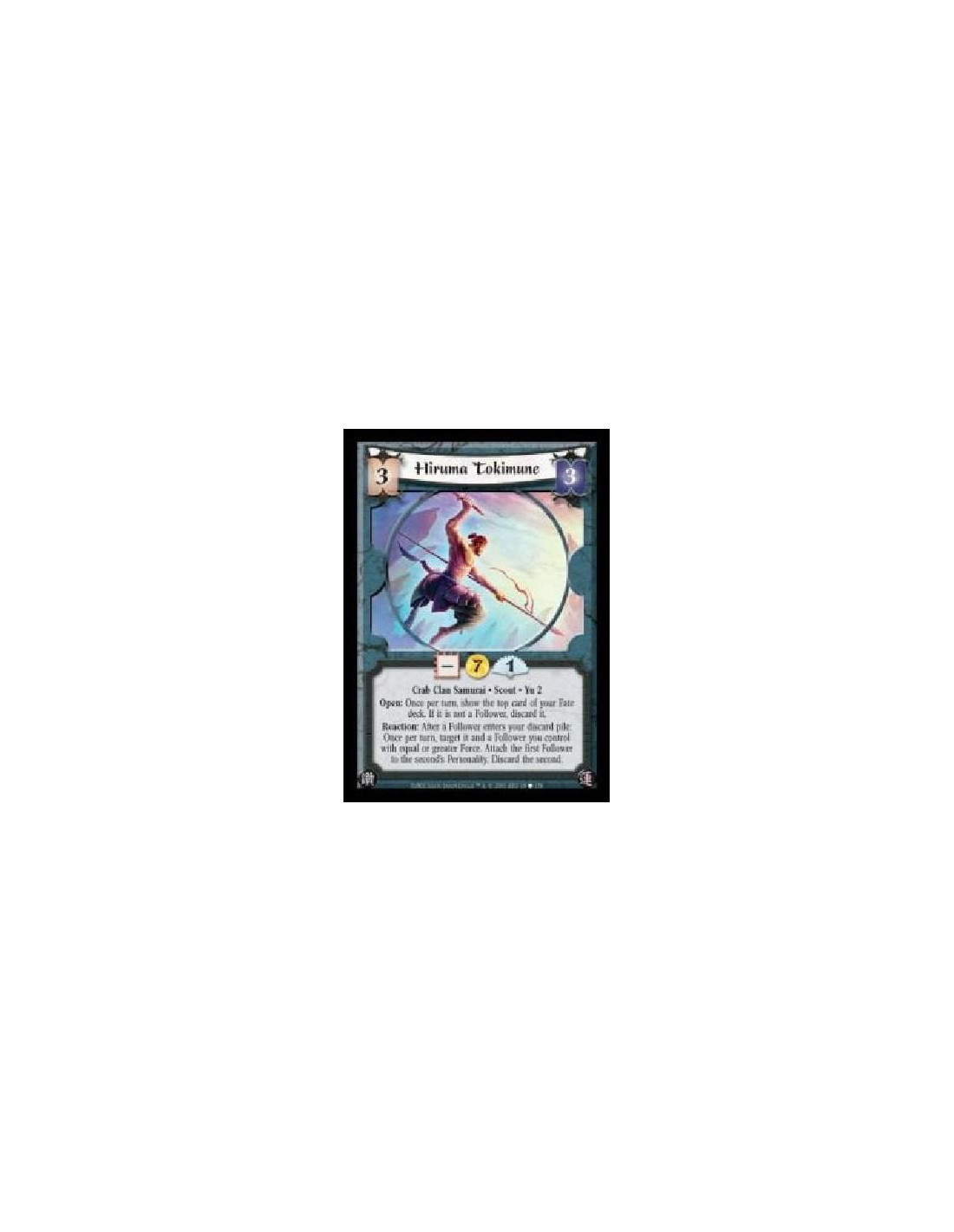 Crab Clan Samurai · Scout · Yu 2. Open: Once per turn, show the top card of your Fate deck. If it is not a Follower, discard it. Reaction: After a Follower enters your discard pile: Once per turn, target it and a Follower you control with equal or greater Force. Attach the first Follower to the second's Personality. Discard the second.